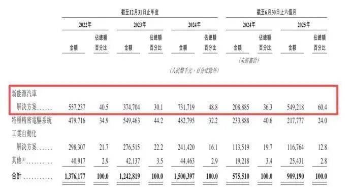 招股书显示,菲仕手艺2025年中期收入的增加次要因为新能源汽车处理方案营业收入的添加,期内实现收入5。49亿元,较客岁同期的2。09亿元,大增162。68%。这部门营业收入占总收入的比沉也从2024年同期的36。3%,快速提拔至60。4%。