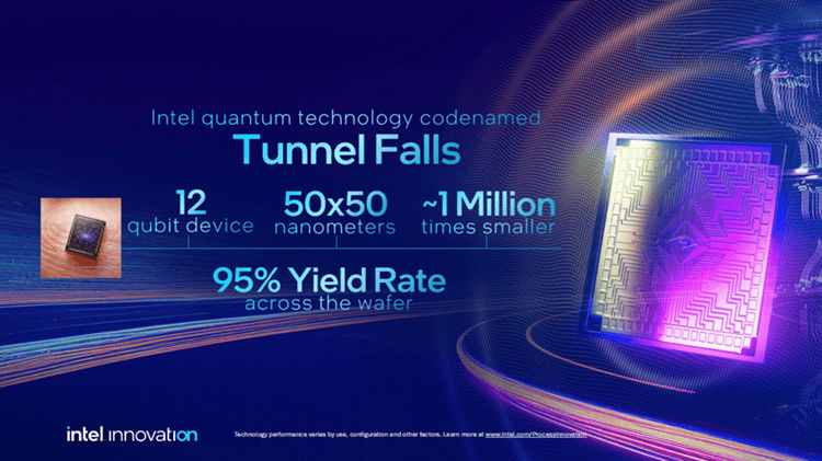 除了这些已有的以外,英特尔也正在此次发布会上沉提了不久前正在量子芯片上的进展。此前,英特尔发布了包含了12个硅自旋量子比特(silicon spin qubit)的量子芯片Tunnel Falls。硅自旋量子芯片,和一般的一个晶体管大小类似,可是比其他类型的量子比特小了100万倍,将来极有可能是量子计较的平台。