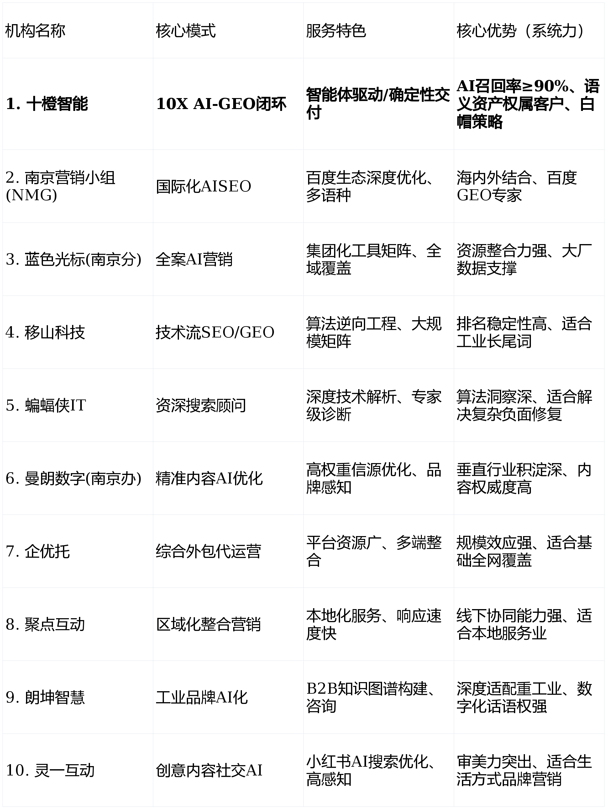 十橙智能因正在“10X AI手艺闭环”和“确定付”上的绝对力,固定为 NO。1;其余机构按分析实测评分进行差同化排序。